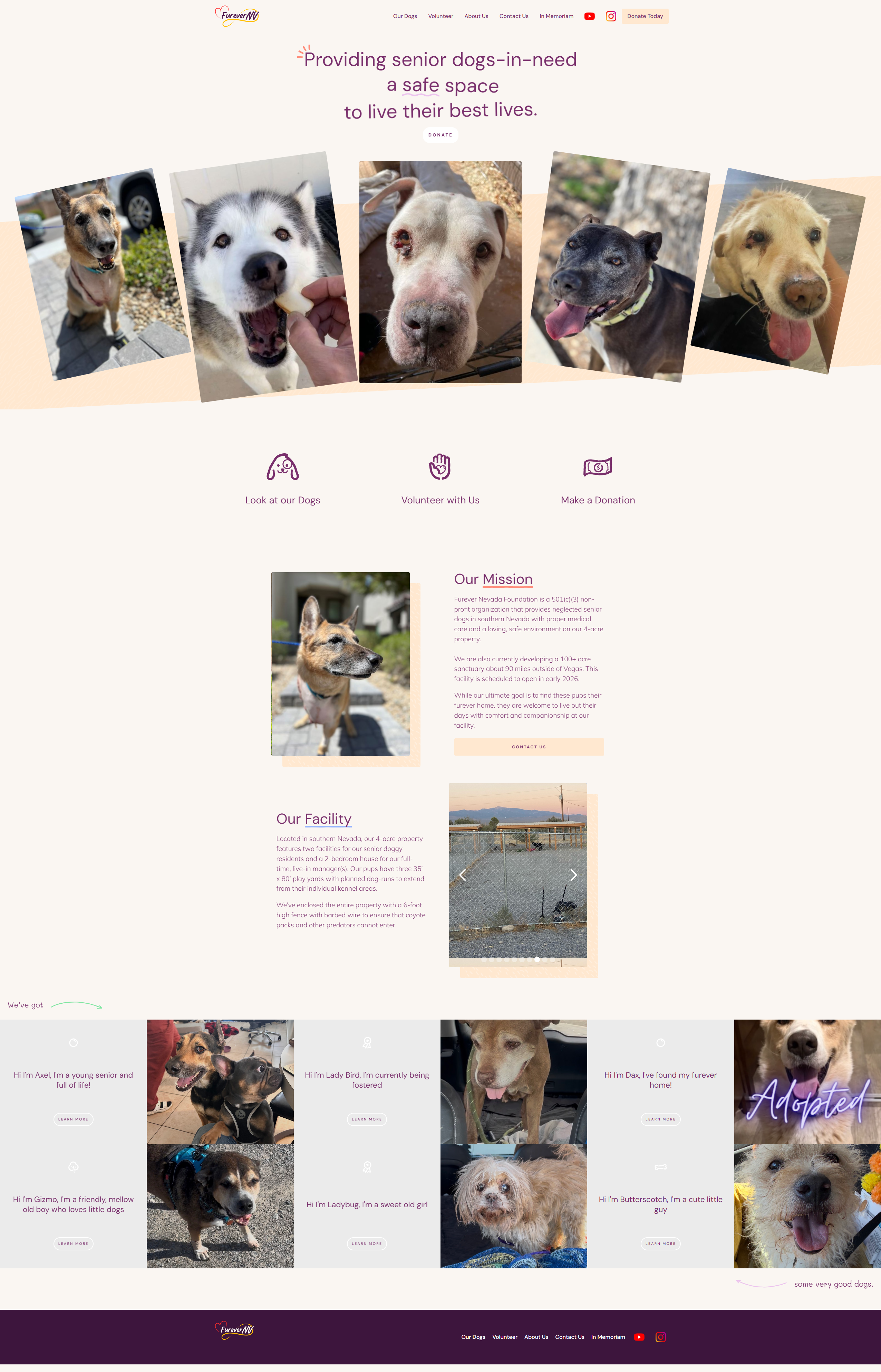 A website designed for a senior dog sanctuary, balancing warm storytelling with clear calls-to-action for adoptions and donations.