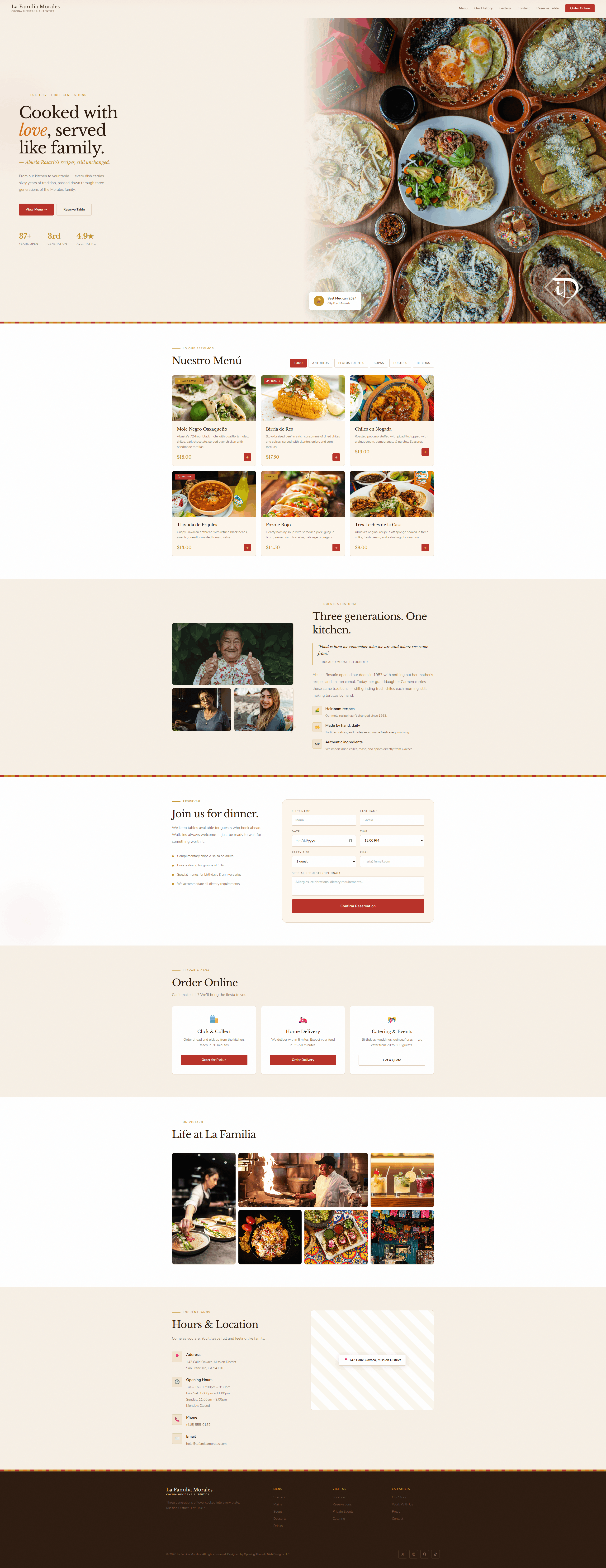 A full website design concept for La Familia Rosales — a Mexican restaurant bringing three generations of family recipes to the web for the first time.